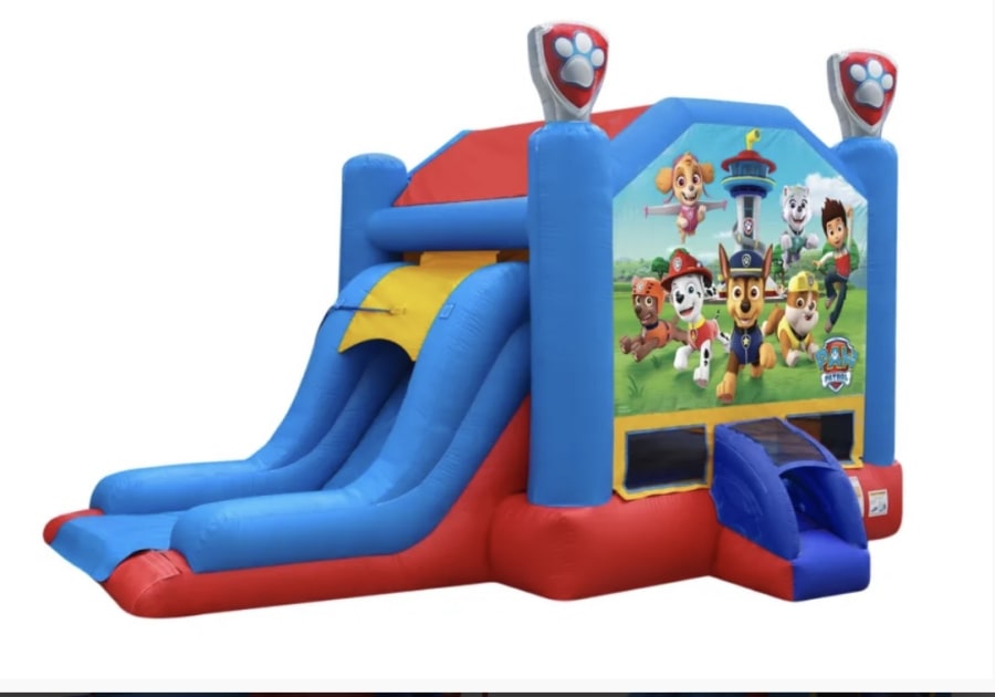 Chase is on the case! The Paw Patrol combo has arrived, offering a 9ft slide that can be used wet or dry. The 15x15 bounce house also allows the kids to bounce and play basketball before taking a trip down the slide ending in a splash.