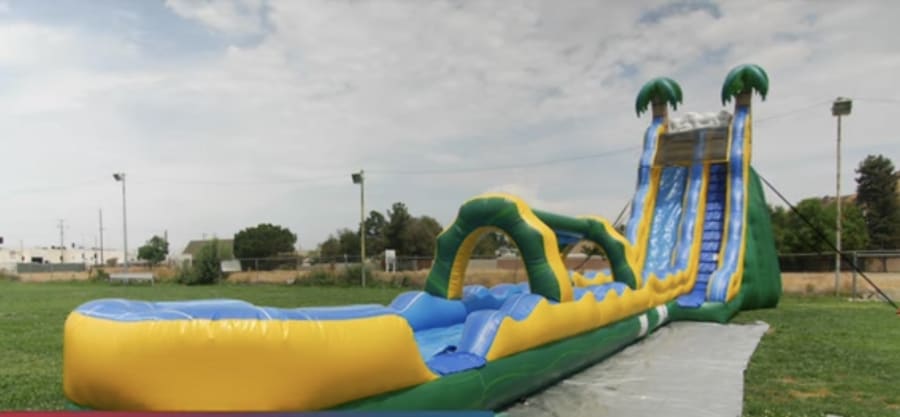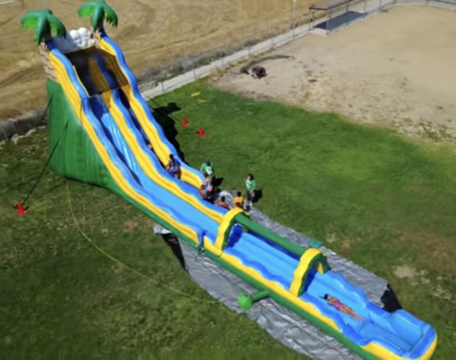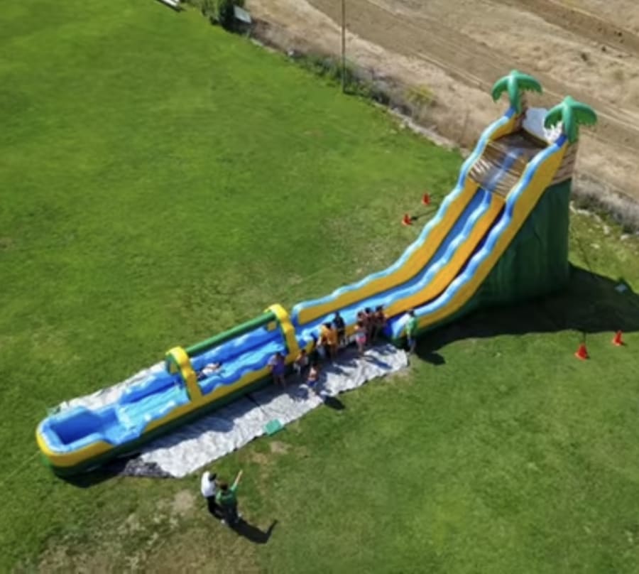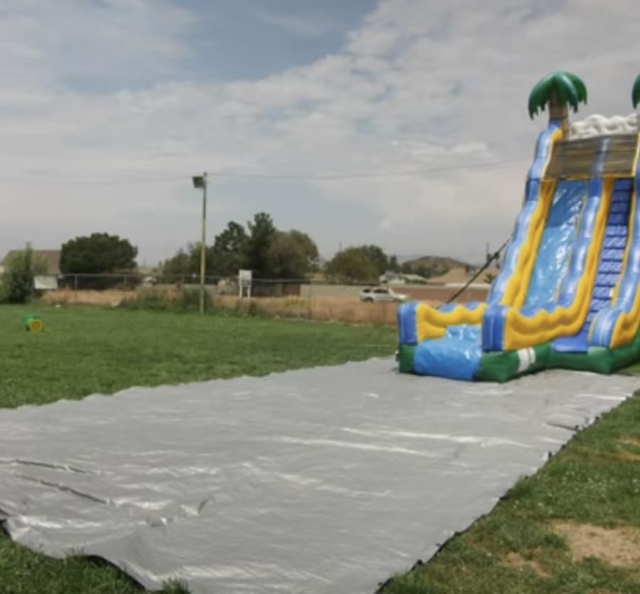 Introducing the Palm Tree wet or dry slide that can be enjoyed all year round. You will certainly have fun sliding and splashing in this must-have inflatable. When using the slide as a water slide, we simply attach a standard garden hose to the water misting system. The Palm Tree can also easily be used as a dry slide by removing the slide-n-slide pool attachment. By using the new and improved stoppers located underneath the slide lining. The inflated stoppers allow for you to stop safely. The Palm Tree offers a slip resistant climbing plat form to help eliminate hazards when climbing, making this perfect for adults and kids!
