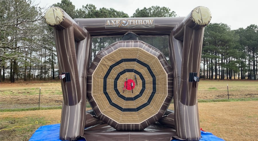 Are you ready for the ultimate interactive game that everyone will love? The inflatable Axe throw will bring out your competitive side while still having a great time with friends or family. The axe throw comes with 4 Blue and 4 Red foam axe's. The axes have velcro strips so when you throw them they velcro to the target!